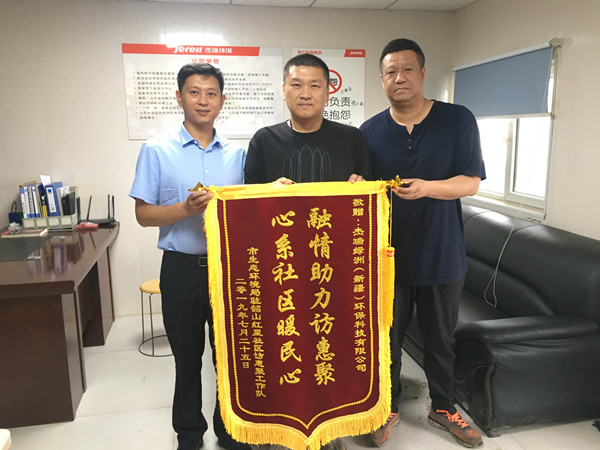 7月25日,新疆克拉玛依市生态环境局驻韶山红星社区“访惠聚”工作队为杰瑞环保子公司杰瑞绿洲(新疆)环保科技有限公司(以下简称杰瑞绿洲)送来印有“融情助力访惠聚,心系社区暖民心”的锦旗,对杰瑞绿洲为社区承建社区学校而提供的物资资助表示感谢。
