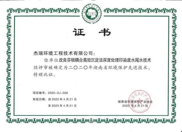 近日,杰瑞环境工程技术有限公司自主研发的“改良芬顿耦合高效沉淀法深度处理印染废水尾水技术”、“JR-COBR高级氧化和深度生化耦合处理技术”、“AAPO污水处理技术”通过湖南省环境保护先进技术评审,被纳入湖南省环境保护先进技术名录;同时,公司典型示范项目“马口镇污水处理厂工程PPP项目”被评为湖南省环境保护先进技术示范工程。